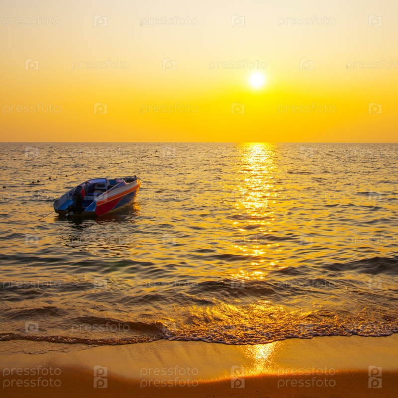 Пляж тропического курорта и лодка в море на закате