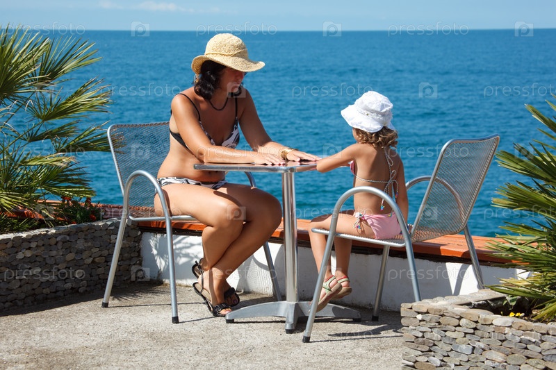 Маленькая девочка со своей матерью в купальных костюмах за столом под открытым небом рядом с морем