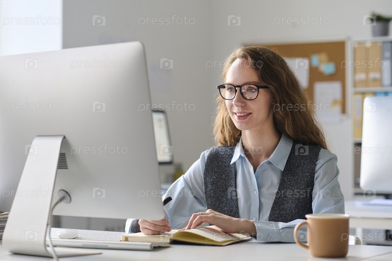 Деловая женщина работает над компьютером на своем рабочем месте