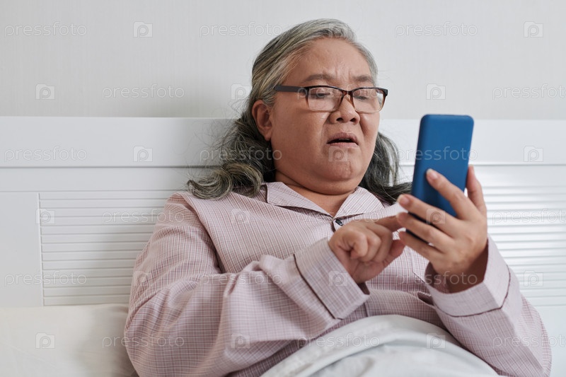 Шокированная старшая женщина читает новости