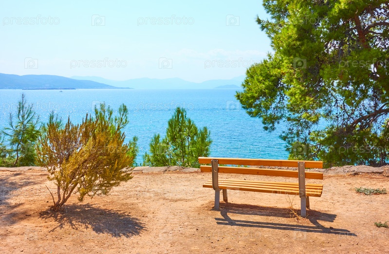 Сад со скамейкой на побережье Эгины