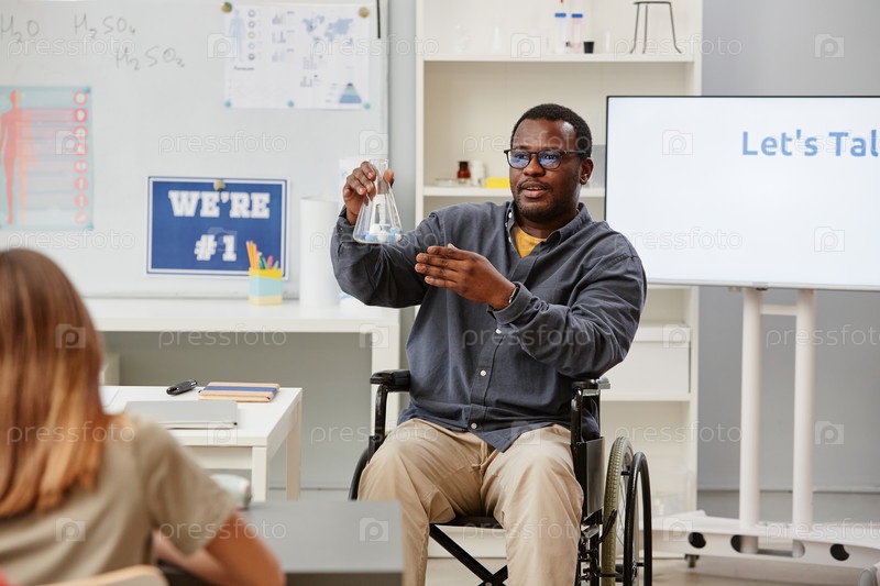 Учитель наук использует инвалидное кресло в классе