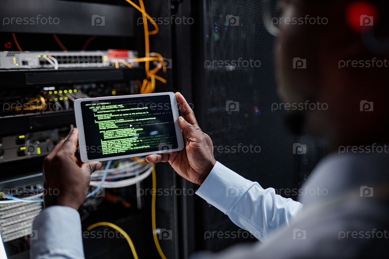 Closeup сетевой инженер, использующий планшет во время настройки серверов