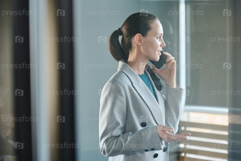 Молодая уверенная в себе женщина-адвокат разговаривает с клиентом по мобильному телефону