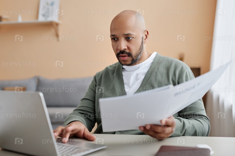 Взрослый чернокожий бизнесмен использует ноутбук дома и просматривает финансовые документы