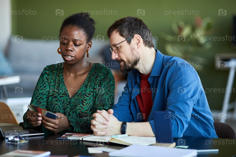 Молодая уверенная в себе деловая женщина с цветовой палитрой консультирует коллегу
