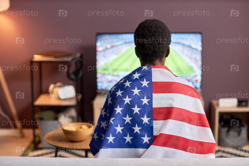 Спортивный фанат, носящий флаг США во время просмотра футбольного матча дома