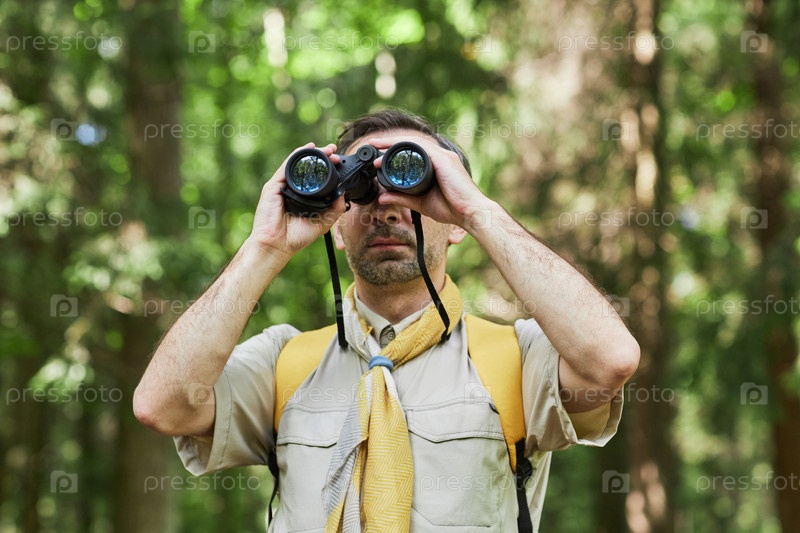Взрослый мужчина как лидер скаутов смотрит в бинокль в лесу