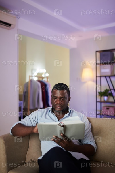Черный мужчина, отдыхающий на диване с книгой