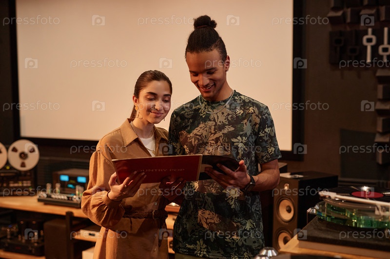 Молодая пара держит виниловые записи в домашней студии