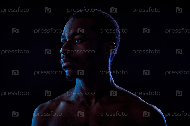 Молодой серьезный афроамериканский мужчина с обнаженным туловищем в темноте