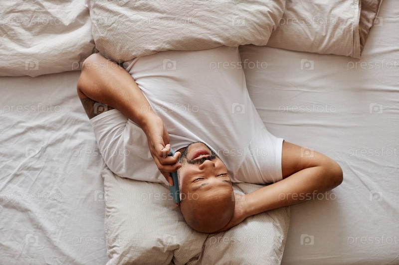 Вид сверху чернокожего мужчины, лежащего в постели и разговаривающего со смартфона