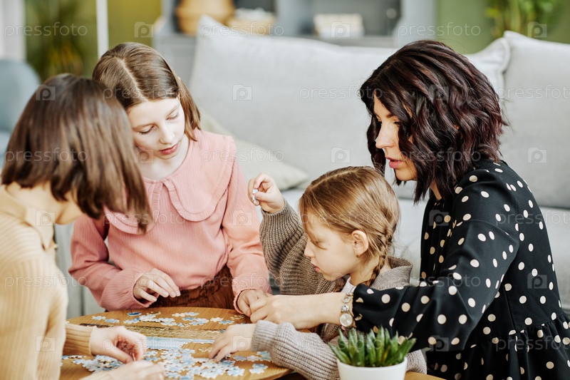 Мать с тремя детьми решает головоломки