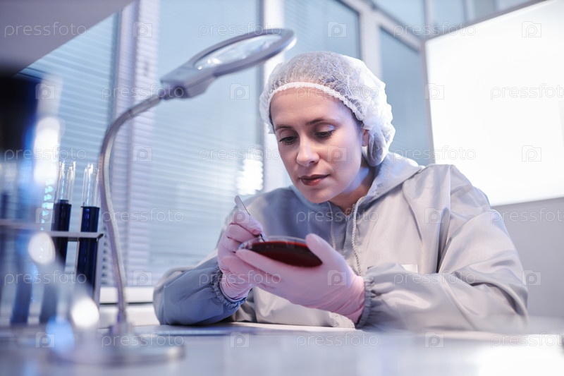 Женщина держит чашу Петри, проводя биологические исследования в лаборатории