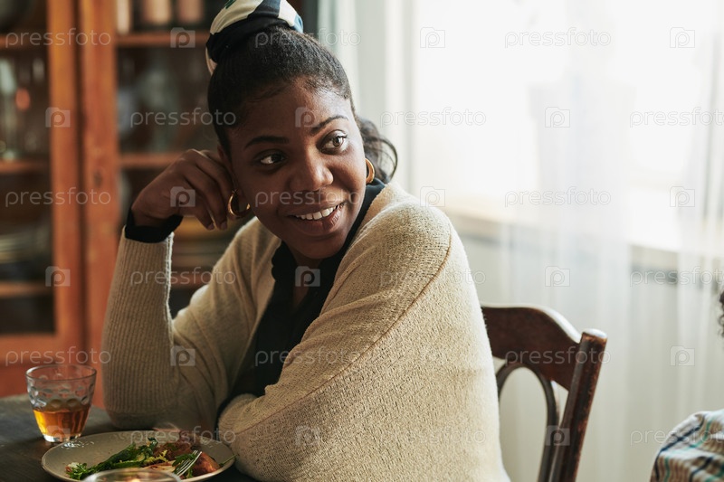 Африканская женщина, сидящая за обеденным столом