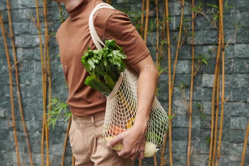 Молодой человек, держащий сетчатую сумку
