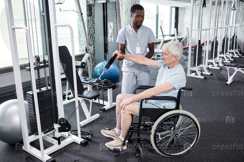 Старший пациент в инвалидном кресле на реабилитационном тренажерном зале