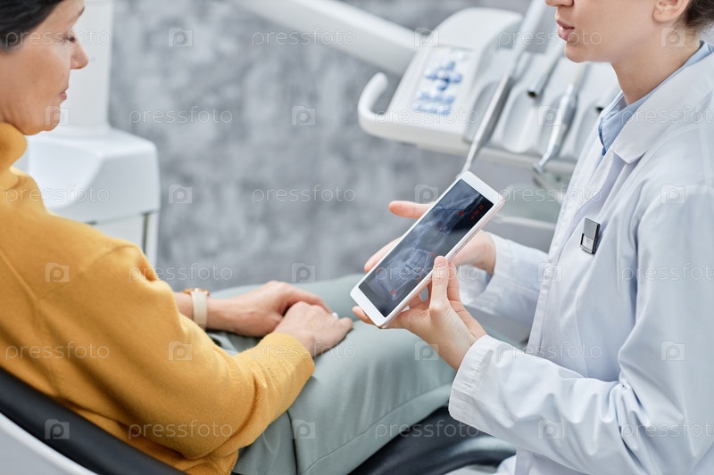 Ближайшее изображение стоматолога, показывающего рентгеновские снимки