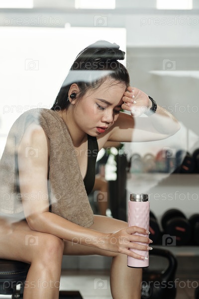 Потная спортсменка, отдыхающая на скамейке