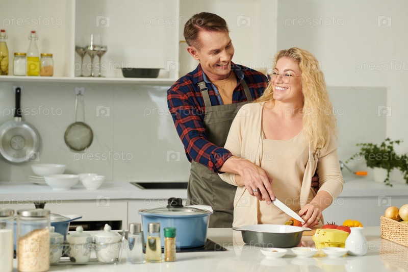 Улыбающаяся пара режет овощи