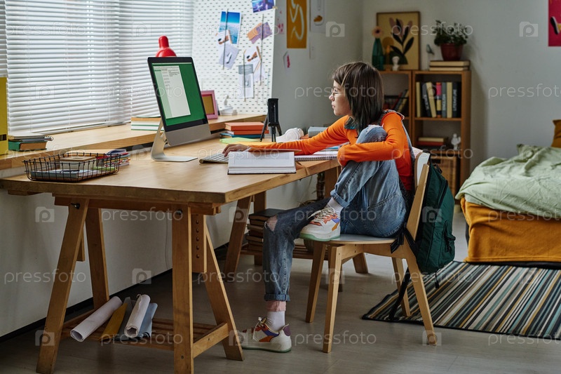 Девушка-подросток учится на компьютере дома