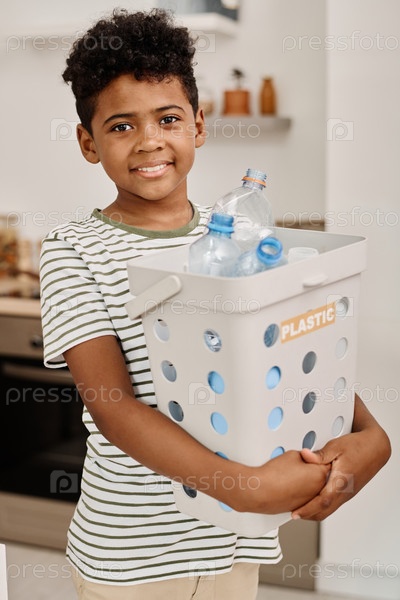 Мальчик сортирует пластиковые бутылки в контейнере