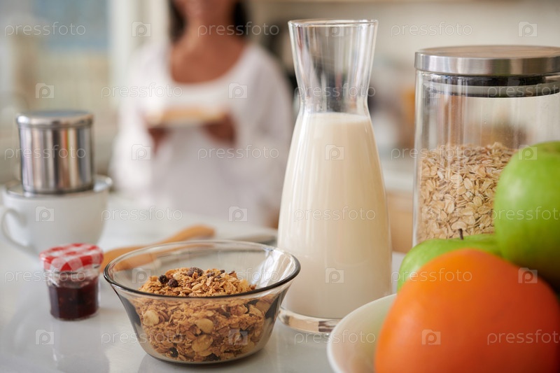 Гранола и молоко на столе