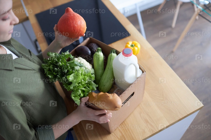 Вид сверху женщины, распаковывающей свежие продукты на кухне