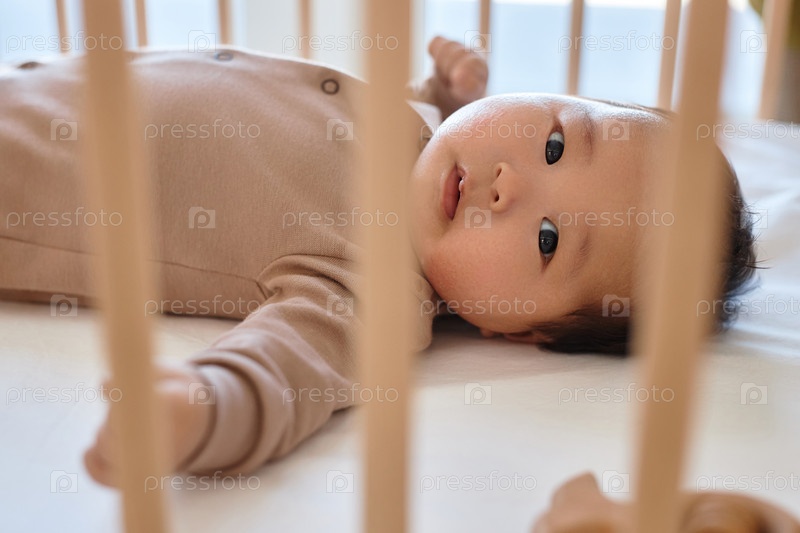 Новорожденный лежит на своей кровати дома