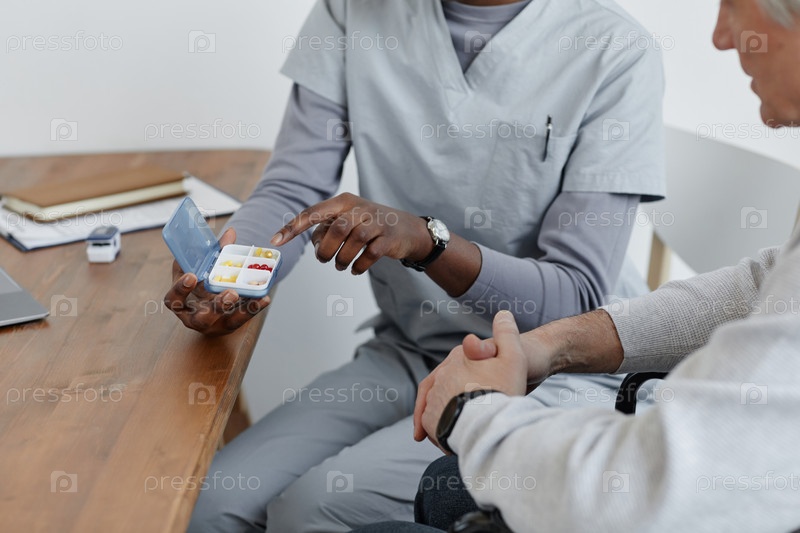 Ближайшее изображение неузнаваемой медсестры, объясняющей медицинский график старшему человеку