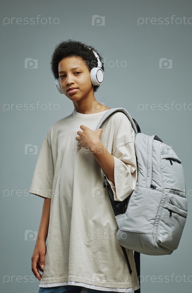 Милая школьница в длинной белой футболке и головках, держащая рюкзак