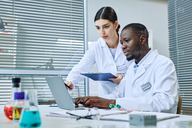 Два ученых, использующих ноутбук для проведения исследований в лаборатории
