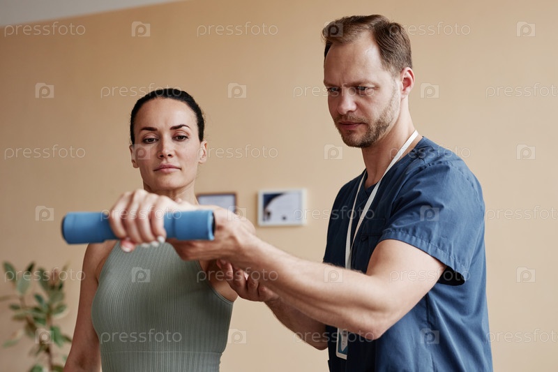 Терапевт обучает пациента во время реабилитации