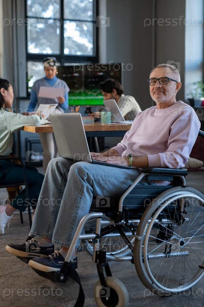 Зрелый сотрудник с ноутбуком на коленях сидит в инвалидной коляске