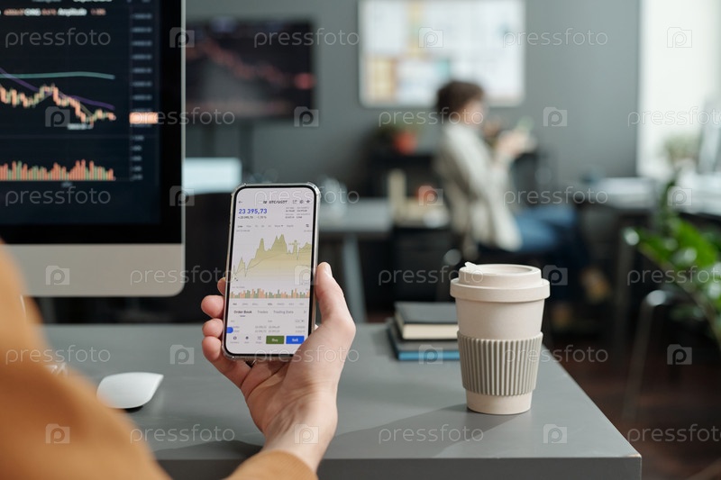 Близкий снимок трейдера, держащего смартфон с графическими данными на экране