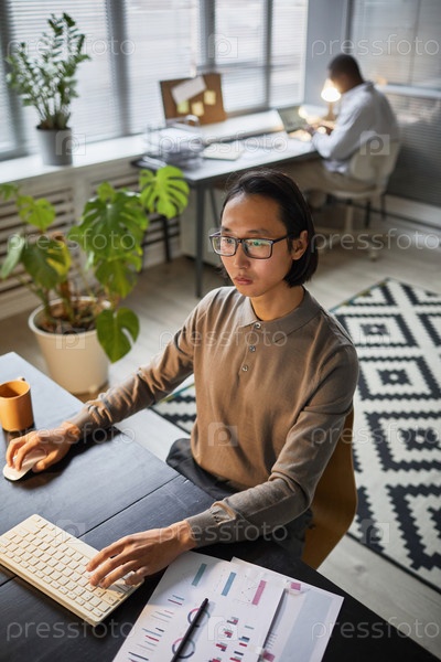 Молодой азиатский бизнесмен, работающий за столом