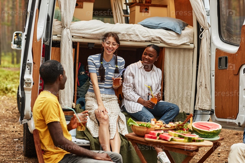 Друзья разговаривают во время пикника на свежем воздухе