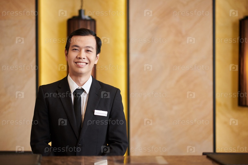 Позитивная азиатская гостиничная рецепционистка