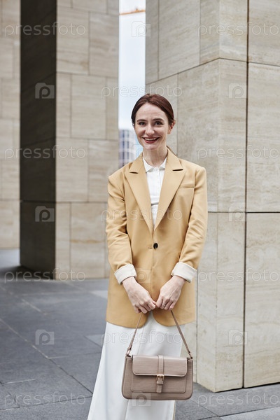 Счастливая молодая женщина, работающая на белом воротничке с сумочкой и смотрящая в камеру