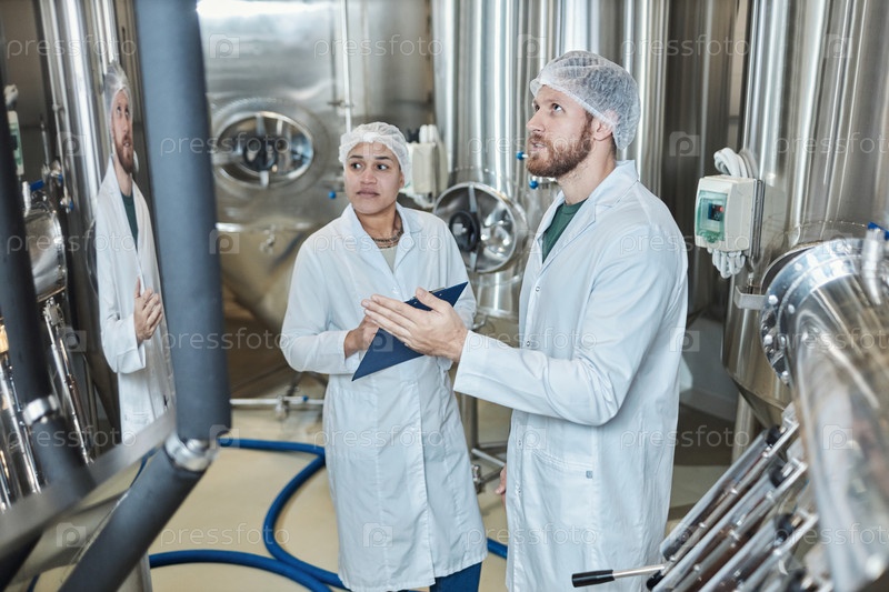 Два человека в лабораторных пальто осматривают цех пищевой фабрики