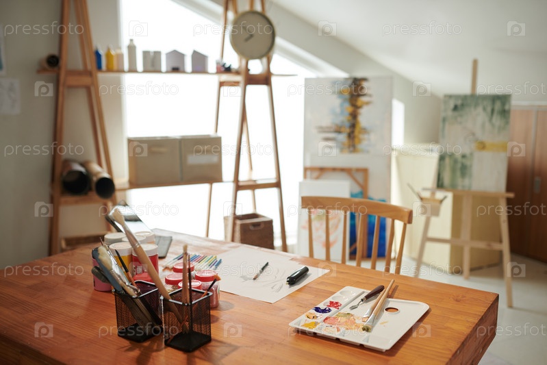 Студия ремесленника с рисунками, картинами и канцелярскими принадлежностями