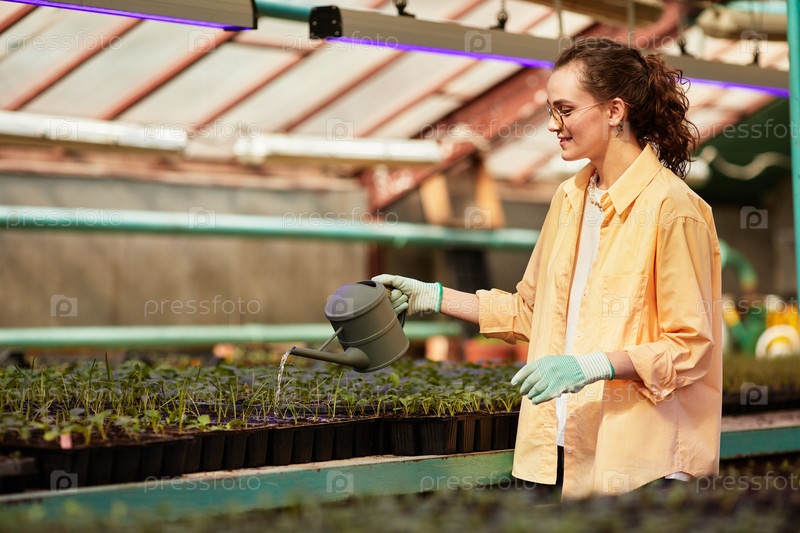 Молодая счастливая женщина в перчатках, рубашке и очках поливает побеги