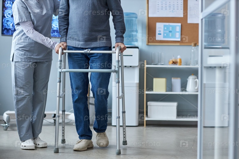 Низкий участок старшего мужчины, использующего мобильный ходун в клинике с помощью медсестры