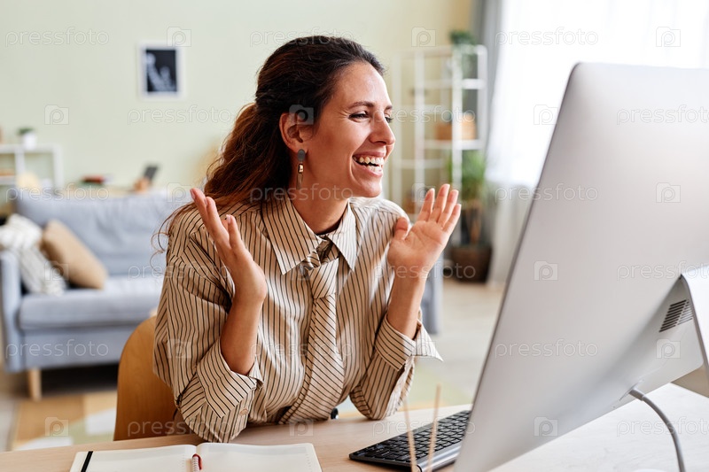 Откровенная радостная женщина в видеозвонке, эмоционально смеющаяся на рабочем месте