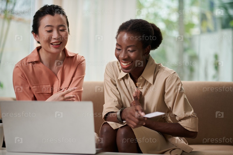 Веселые молодые женщины вместе делают покупки в Интернете
