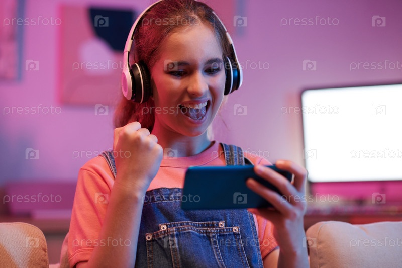 Подростковая девушка празднует победу в игре