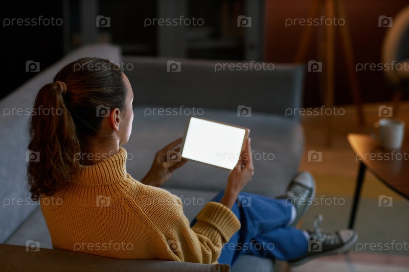 Женщина держит цифровой планшет с макетом белого экрана, отдыхая на диване дома