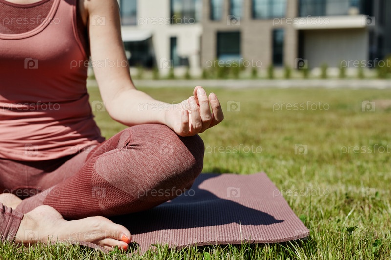 Молодая женщина сидит в позе лотоса, наслаждаясь йогой на свежем воздухе