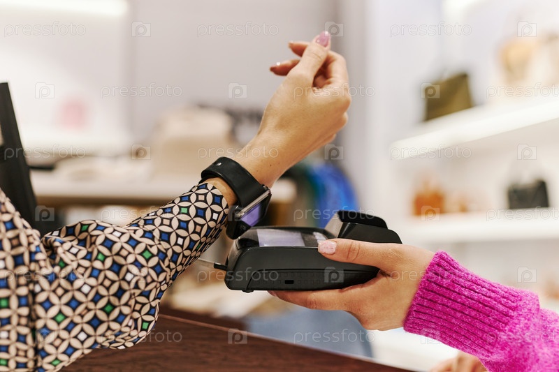 Близкий снимок женщины, платящей через умные часы в бутике или торговом центре