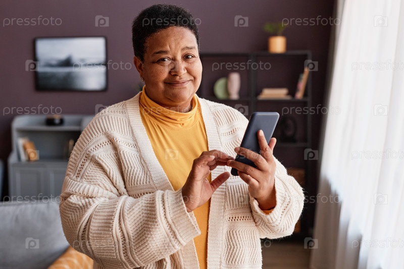 Чернокожая старшая женщина, держащая смартфон, стоит у окна